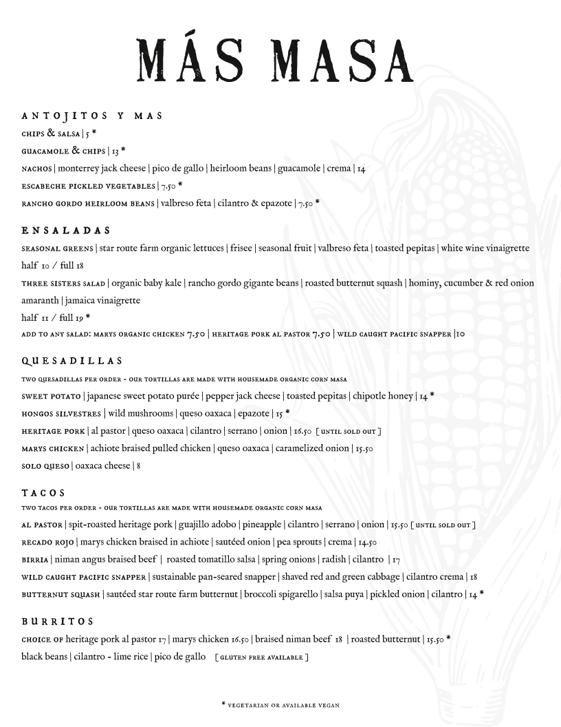 Welcome to Más Masa, a charming gem nestled in Fairfax, California. This restaurant elevates traditional Mexican cuisine by utilizing organic, non-GMO ingredients, producing fresh tortillas that add authenticity to each dish.